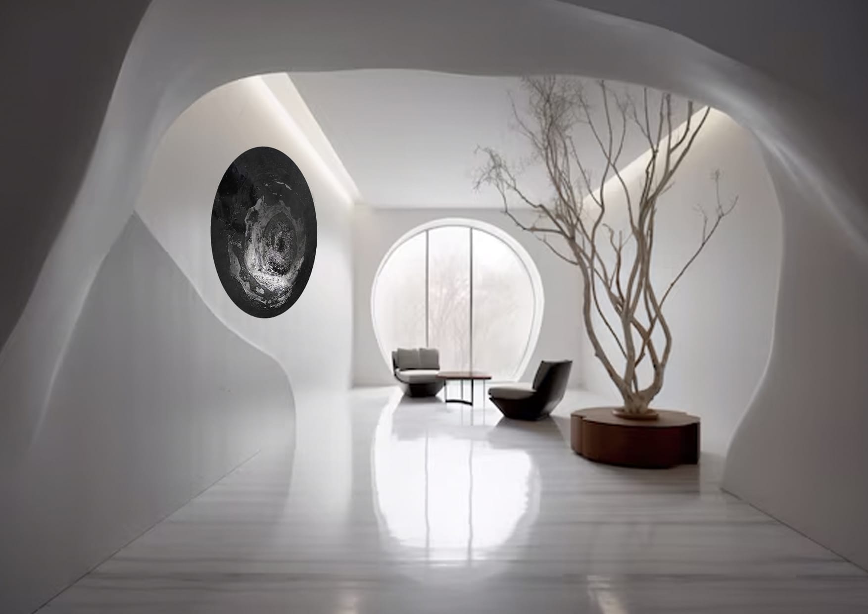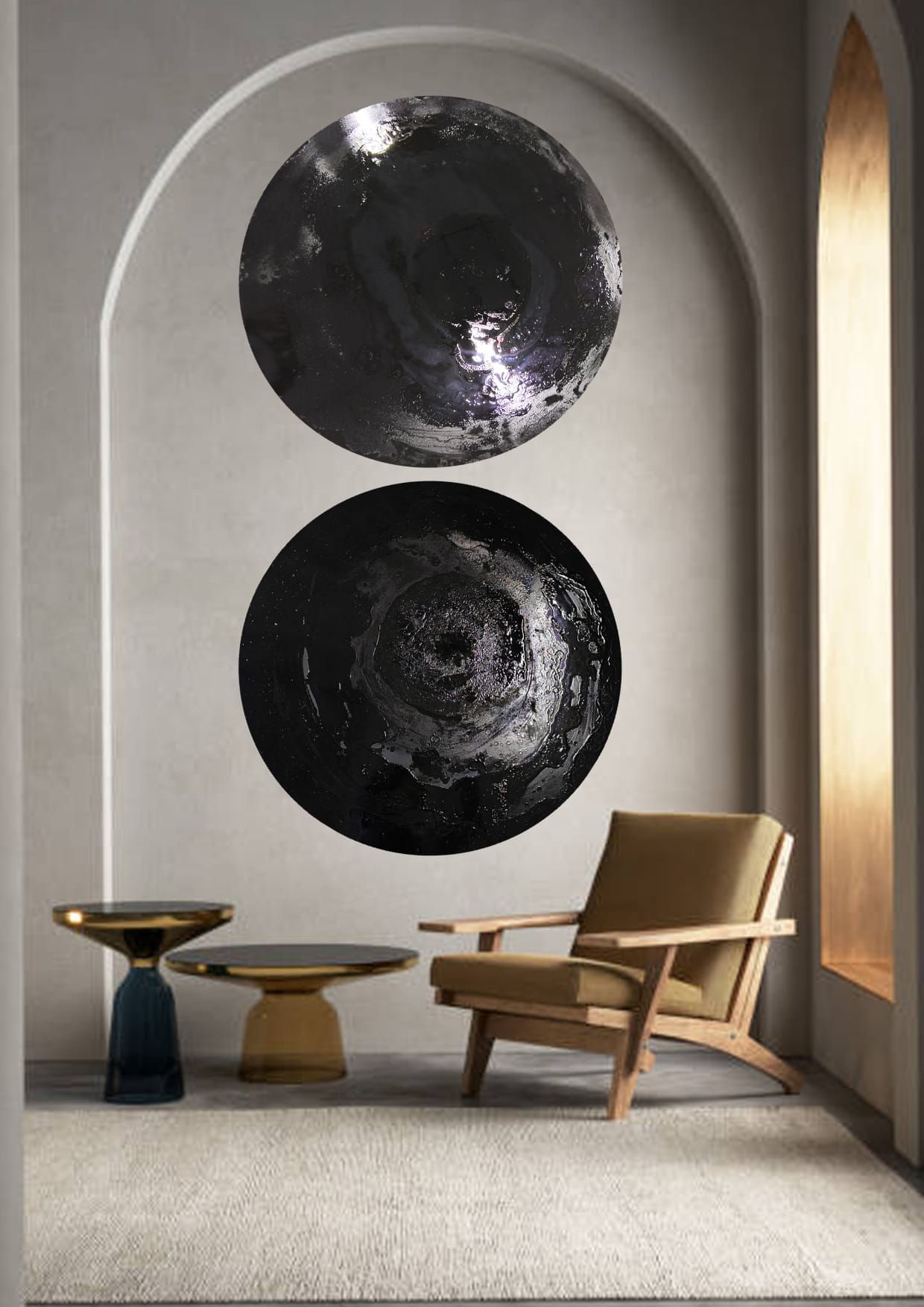 Le diptyque met en tension des polarités fondamentales — ombre et lumière, plein et vide, attraction et distance. La référence à l’éclipse suggère un moment de bascule, un alignement fragile où les forces se neutralisent autant qu’elles se révèlent. Dans cet entre-deux, la peinture agit comme une surface de méditation, presque cosmique, où l’échelle humaine se dissout.