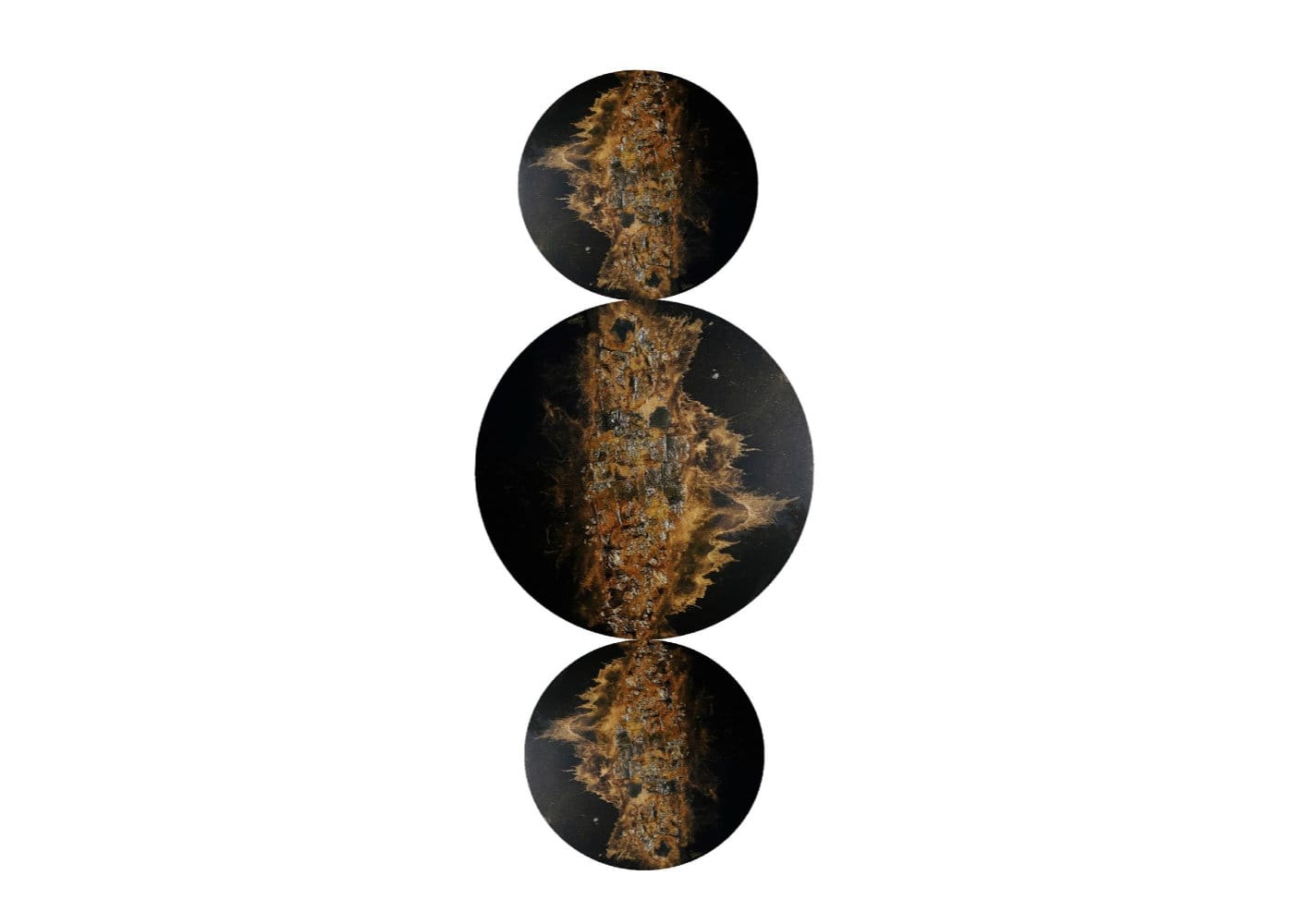 With the Totem (2023) collection and the Trinité Or triptych, pushing the boundaries between the real and the imaginary, each work establishes a permeability between the composition and the external world, which in turn becomes an active part of the representation. We then enter a true three-dimensional bubble, where the artwork flirts and unites with its viewer and its cosmos. Landmarks are blurred and disturbed. Limits are shifted, rethought, reinvented.