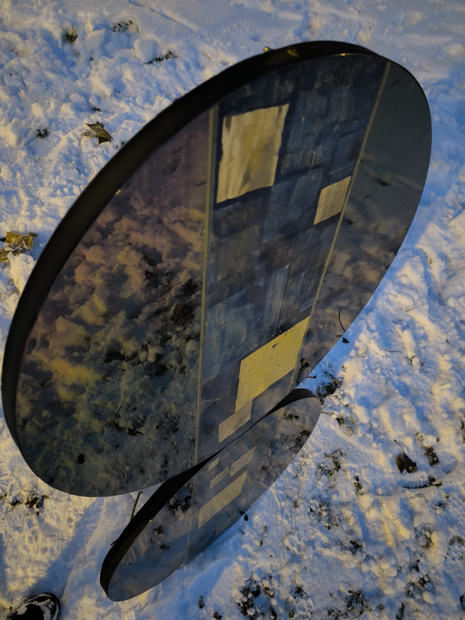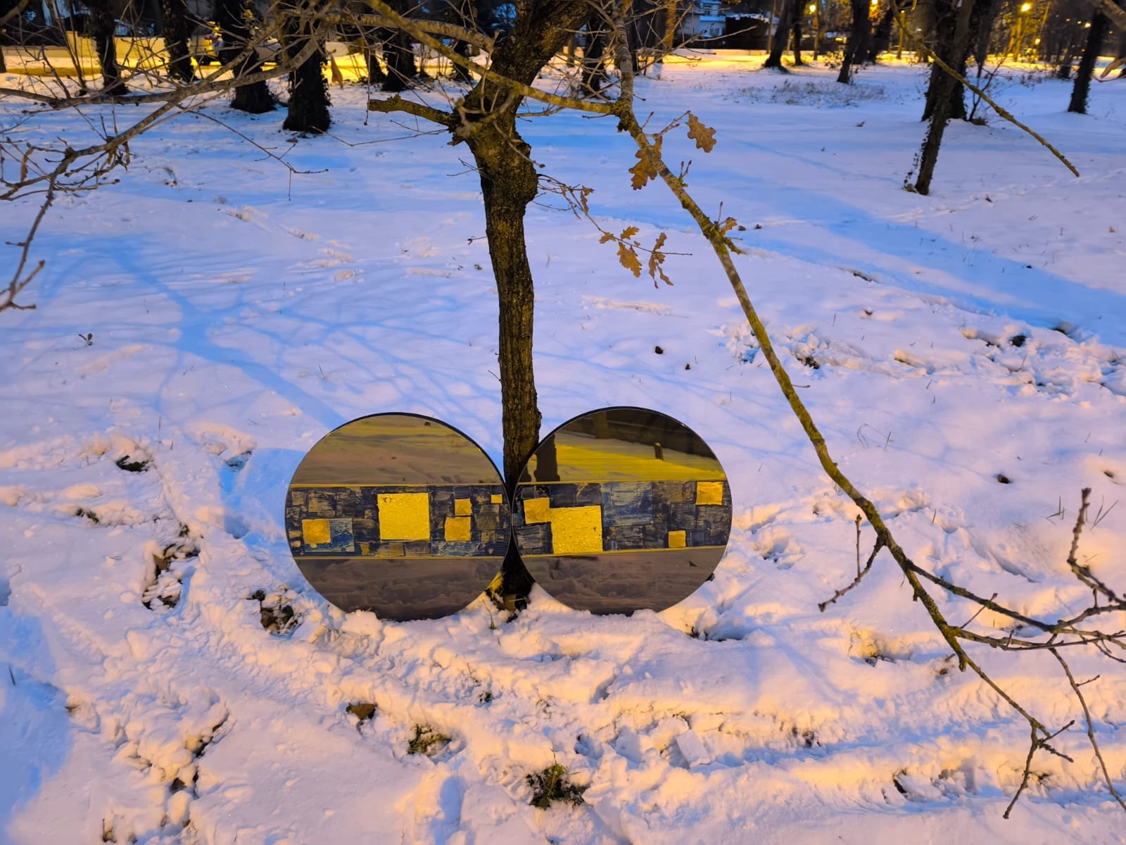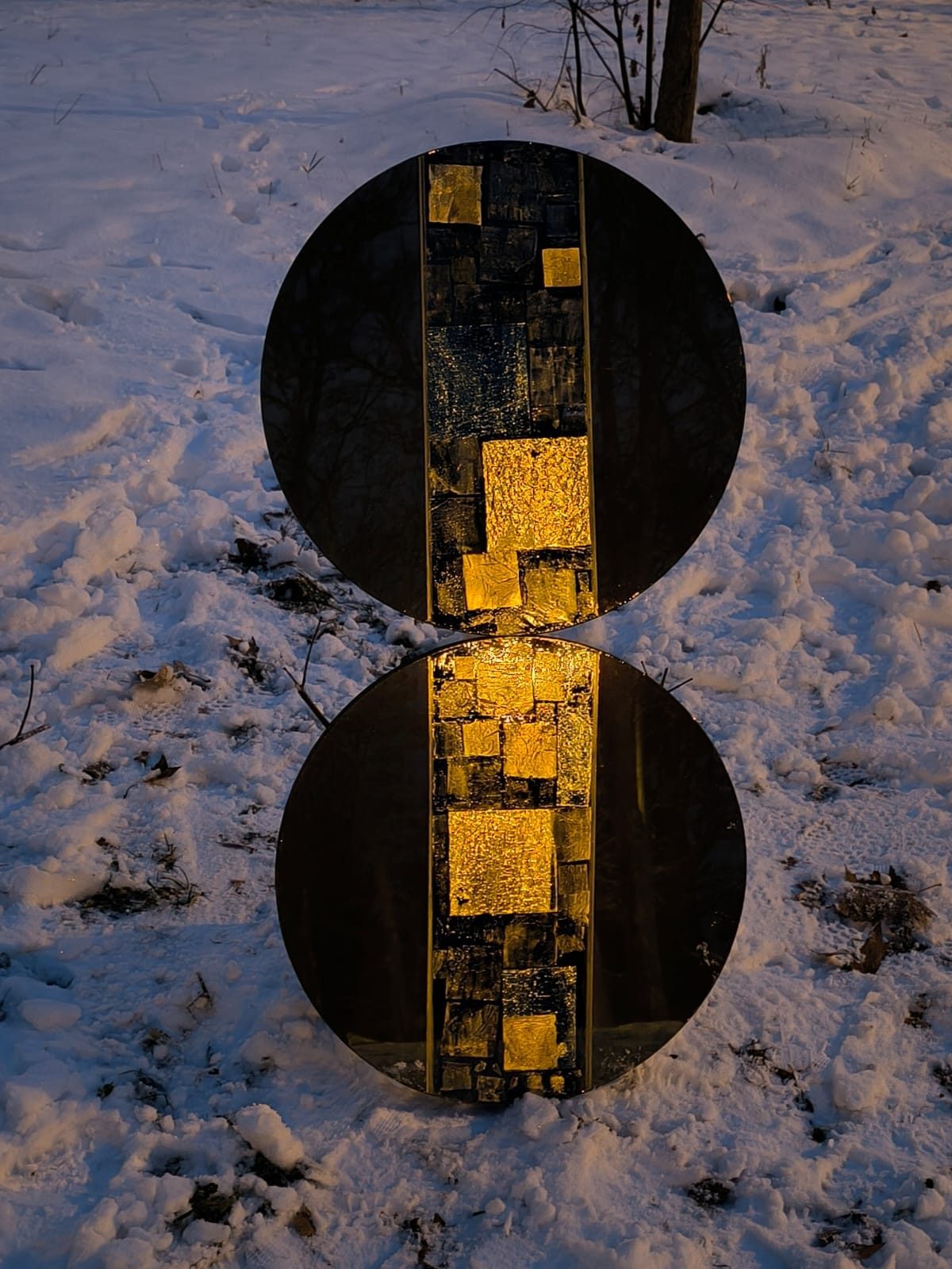120 × 60 cm (⌀ 60 cm × 2) · Fibres réfléchissantes fusionnées, pigments précieux et feuilles d'or 24 carats · 2023
